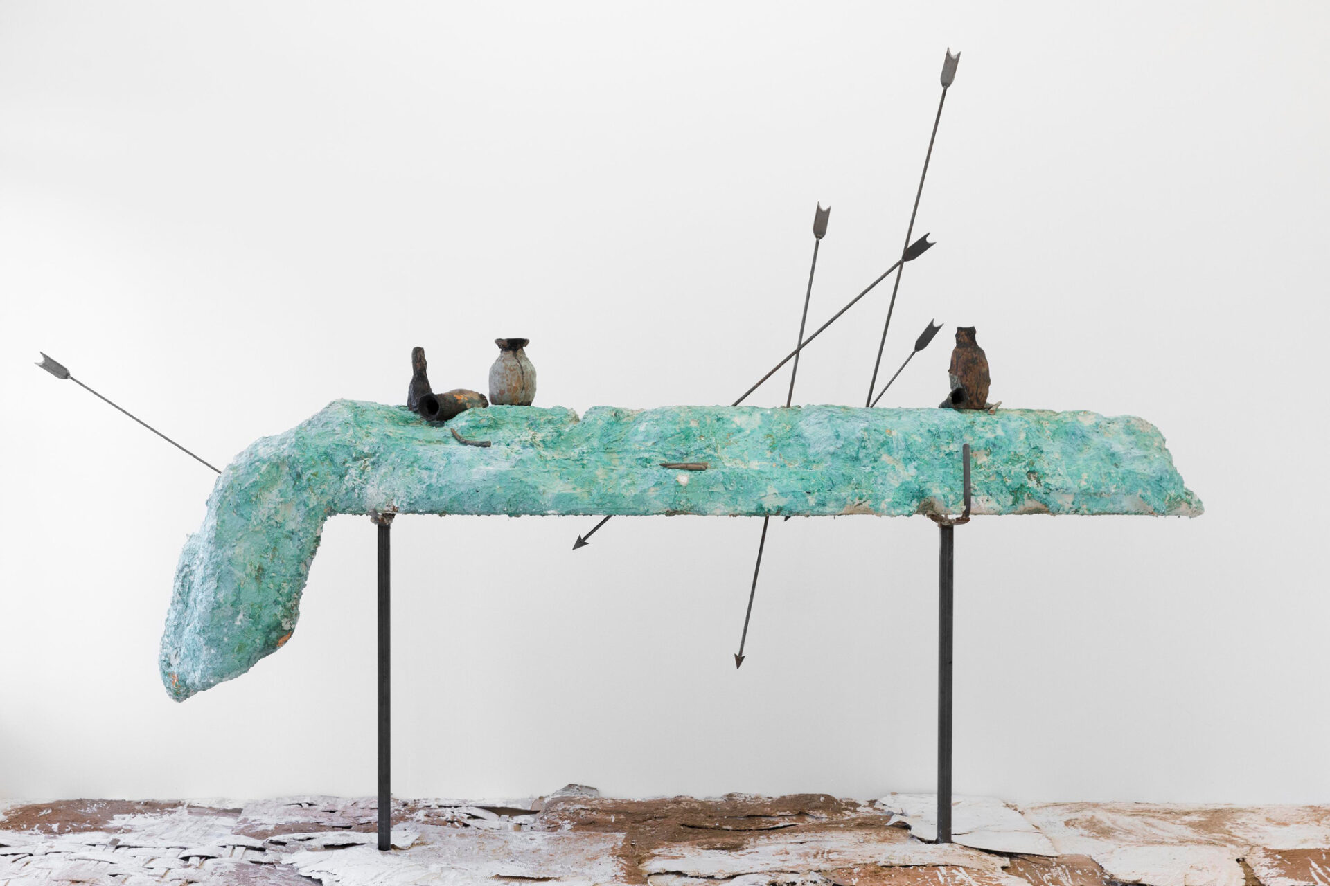 Each time one of Alrai’s installations is displayed and reconfigured, elements of previous exhibitions begin to deteriorate, adding to the faux archaeological environment, whilst new elements are added. In doing so she creates works that reverse a museological convention of preservation, shedding previous narratives at the same time as imbuing them with memory and autonomy.